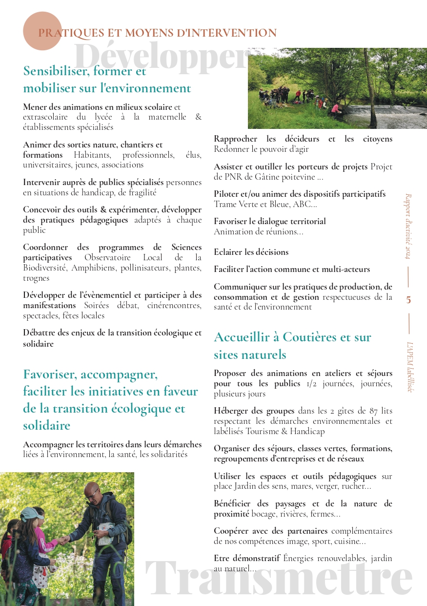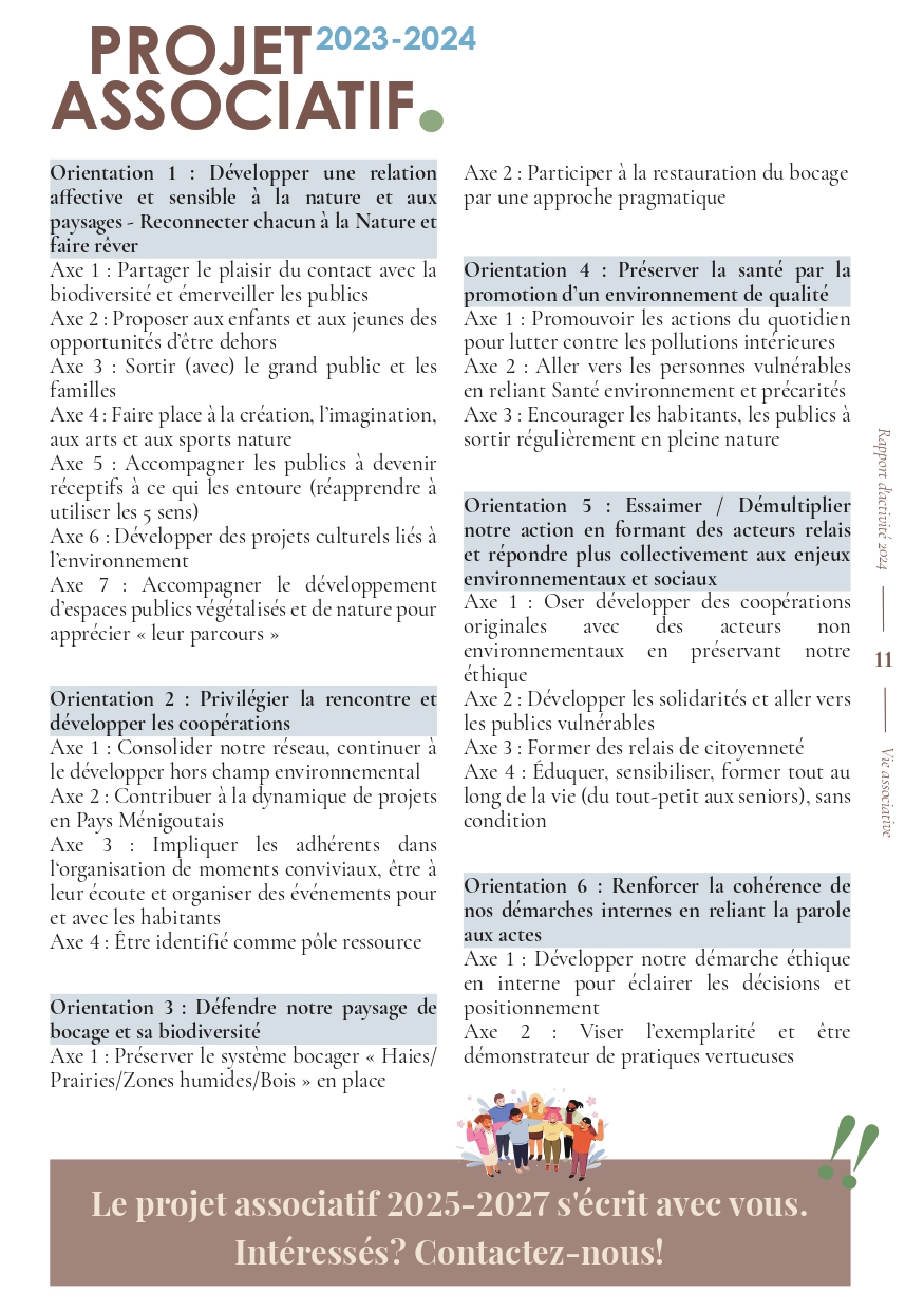Notre projet associatif est présenté en six orientations, elles-même déclinées en actions de terrain, sur le territoire, illustrées dans le rapport d’activité. Notre équipe de 12 salariés déploie ses compétences, son dynamisme, avec l'envie d’aller toujours de l’avant pour de répondre aux enjeux environnementaux.