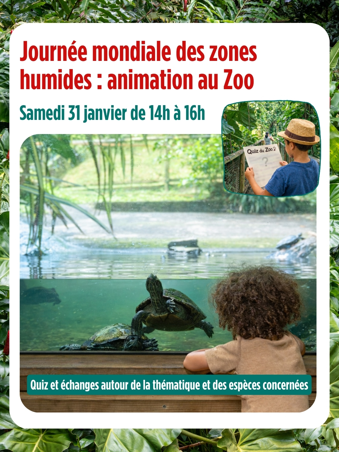 - Ateliers pédagogiques aux thèmes variés visant à faire découvrir le mode de vie des espèces, leurs particularités et les menaces qui pèsent sur leur survie, afin de sensibiliser les jeunes à la biodiversité et à la préservation du vivant.